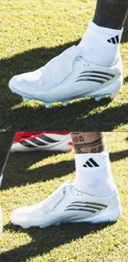 这款战靴的一大亮点在于其极具风格化的三条纹设计,三条纹线条犀利、醒目,与鞋面完美融合,宛如“利爪”,这赋予了战靴精致而又不失力量感的外观。梅西最近在训练中被拍到穿着一双白色球鞋,与这款“El Último Tango”非常相似。现在看来,他当时正在为世界杯战靴做测试。